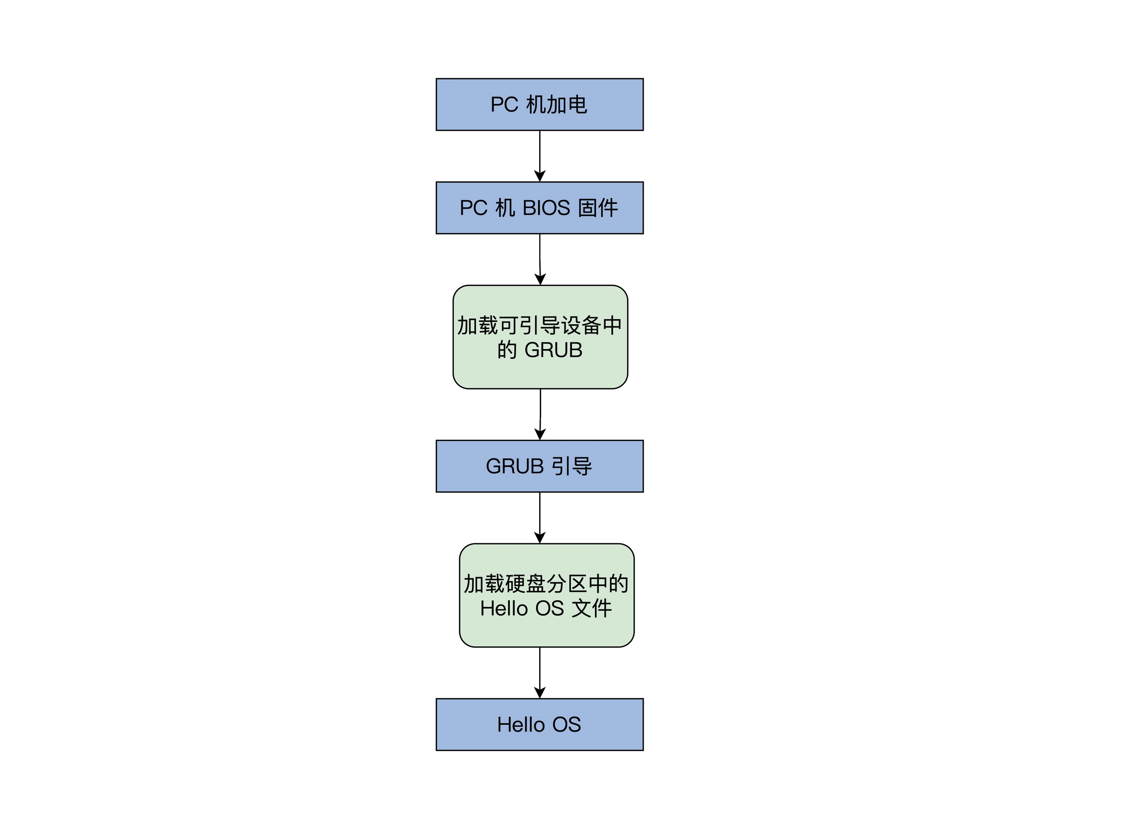 现有的商业操作系统都是基于这两种语言写出来的,操作系统开机的引导流程如下(如我们需要启动的操作系统是Hello OS)